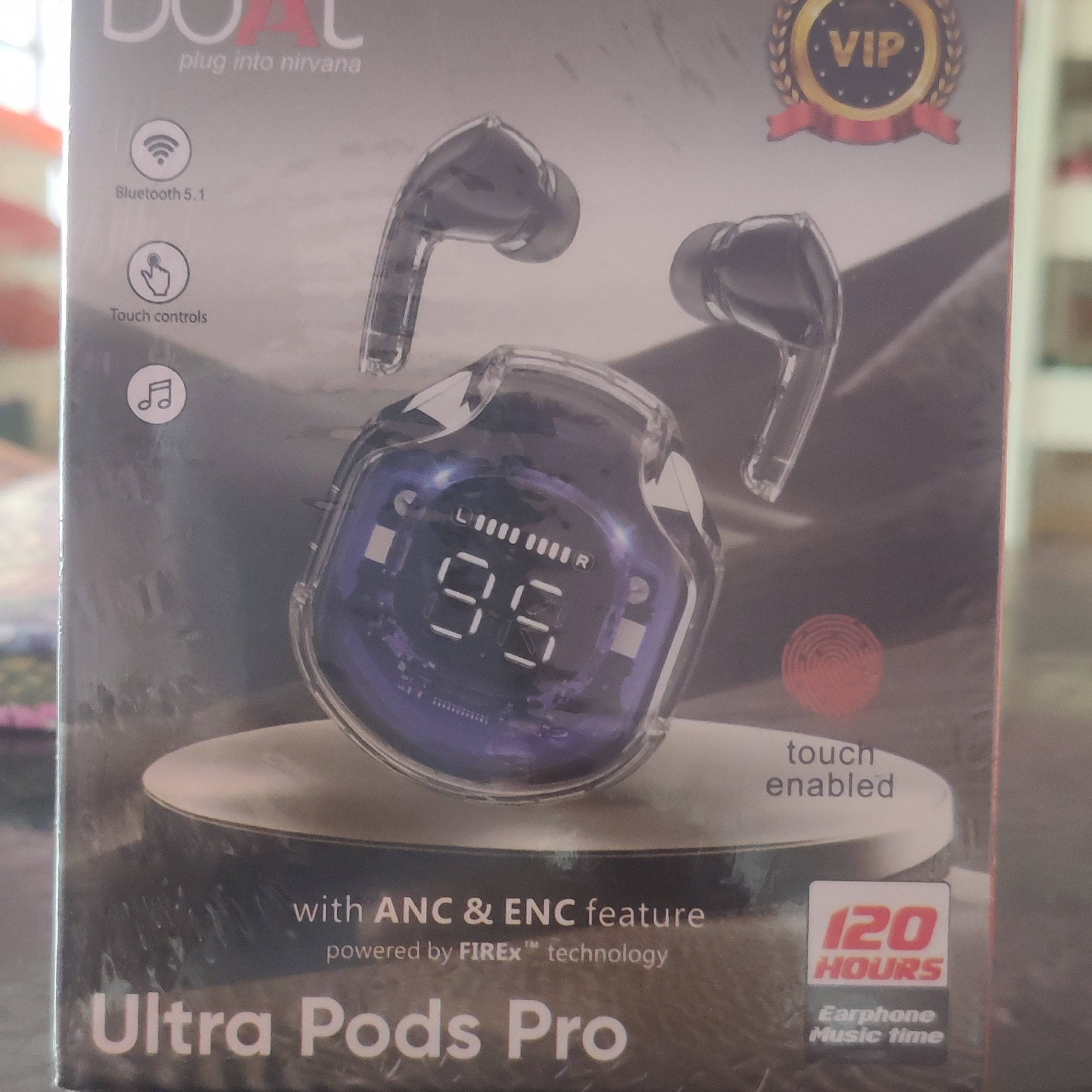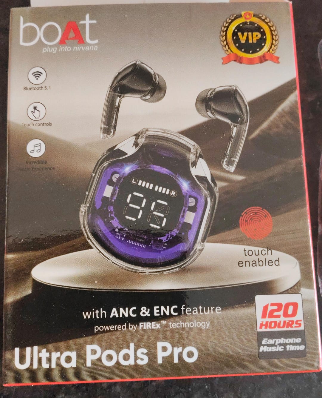 The boAt Ultra Pro is a pair of wireless TWS earbuds featuring boAt's Signature Sound, Spatial Audio, and long-lasting battery life. They also offer multipoint connectivity and AI-powered noise cancellation for clearer calls.