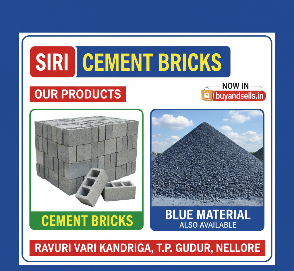 Located in Ravuri Vari Kandriga, T.P. Gudur, Nellore, we provide high-quality construction materials to ensure your building stands strong for generations. We specialize in durable cement bricks and premium "Blue Material" (Blue Metal/Aggregates) for all types of construction needs.
